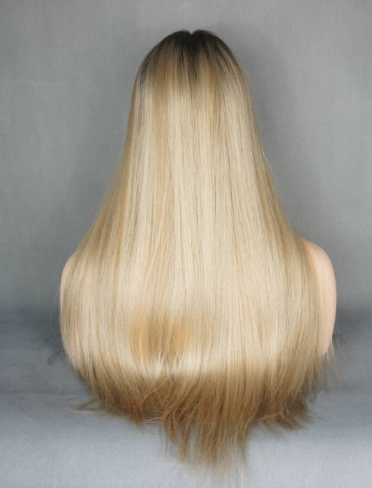 Stock Chinese Rooted Light Ash Blonde Ombre Straight Human Hair Silk Top Wig