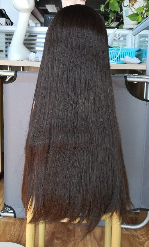 Stock European Brown Straight, Slight Layer Human Hair Jewish Wig 30" with Silk Top 150% Density